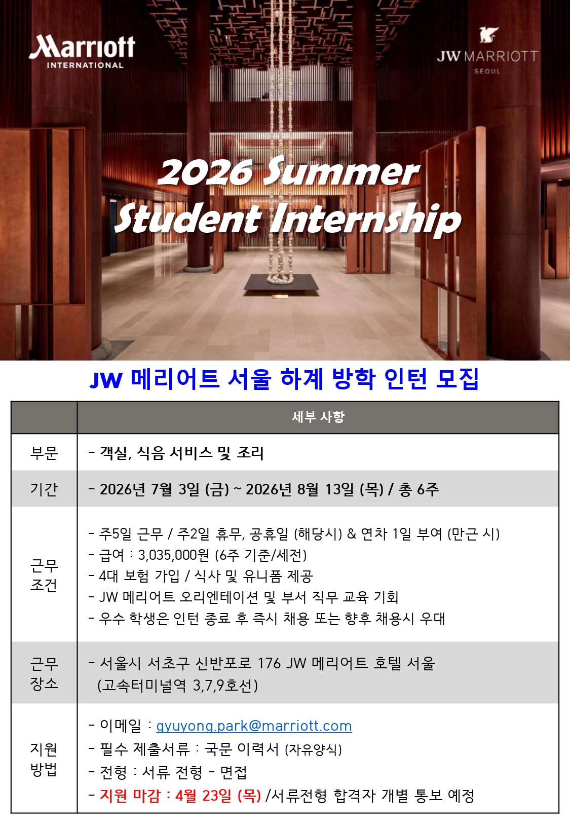 취업정보 채용정보 취업현황 채용정보Home취업정보채용정보 JW 메리어트 서울 하계 방학 인턴 모집 안내 작성자 : 학과관리자 | 작성일 : 2026.04.10 | 조회수 : 183 첨부파일 2026 JW 메리어트 서울 하계 방학 인턴 모집 안내문_page-0001.jpg 목록 이전글 2026년 파라다이스 호텔 부산 하계실습 모집 공고 안내 다음글 조선호텔 & 리조트 현장실습학기제 안내